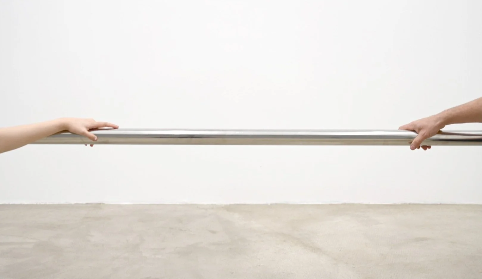 This awakening of the senses and memory continues in other works throughout the same section. At the center of the space stands the installation 13 Hours: Disappearing Temperature (2021), composed of a steel pipe suspended between two heavy wooden crates, each housing a cooling and a heating device at either end—pushing hot and cold toward one another. The installation’s scale and material weight dominate the room, yet its emotional tone is unexpectedly tender and intimate. Artist Dou Weiyu translates the tension and fading of a long-distance relationship into temperature and touch, amplifying the subtle, internal experience of emotional fluctuation.